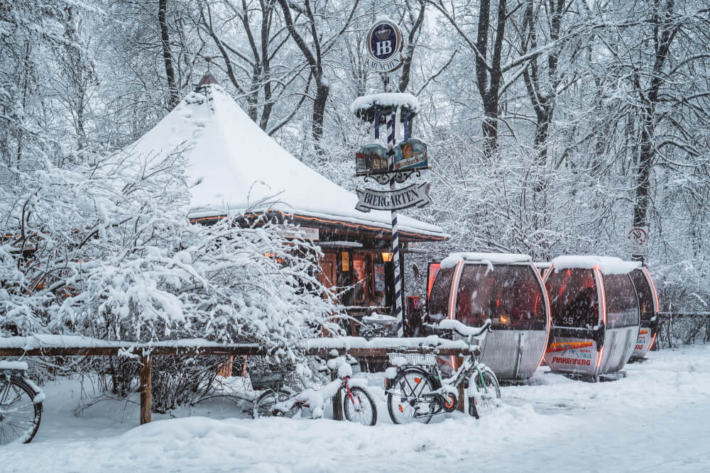 Located just off of theĀ KƶniginstraĆe entrance to the English Garden (near theĀ UniversitƤt U-Bahn stop), you’ll find the adorable MilchhƤusl kiosk, which offers a 100% bio menu along with cozy ski gondolas that you can sip drinks in during the winter time. Just look at how magical it looks in the snow!