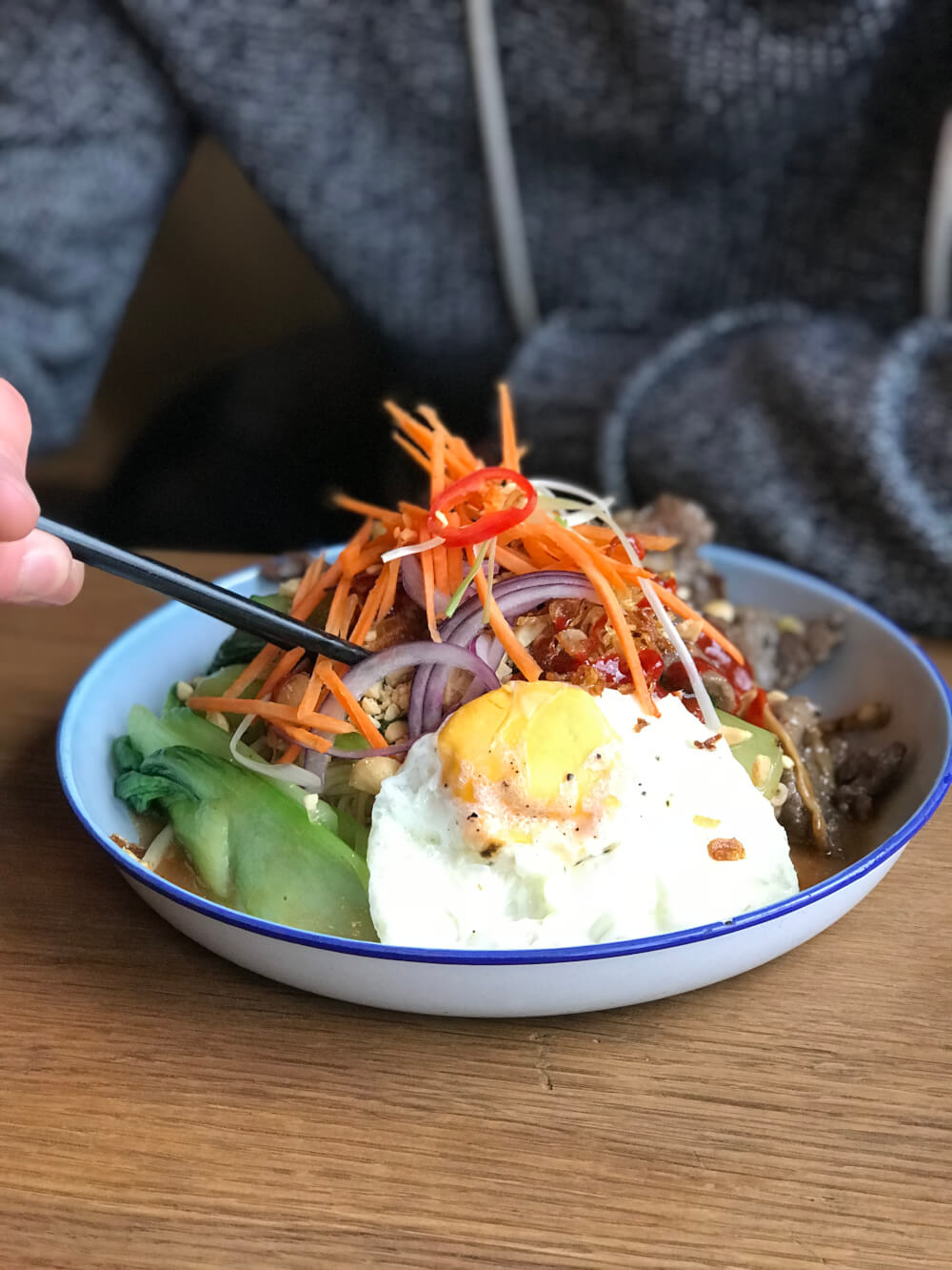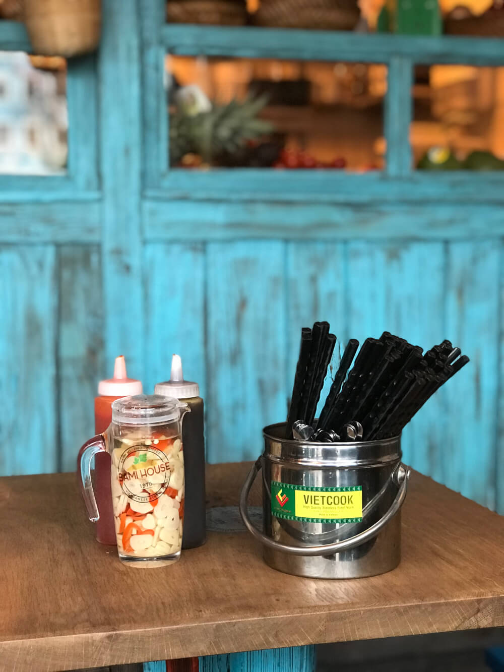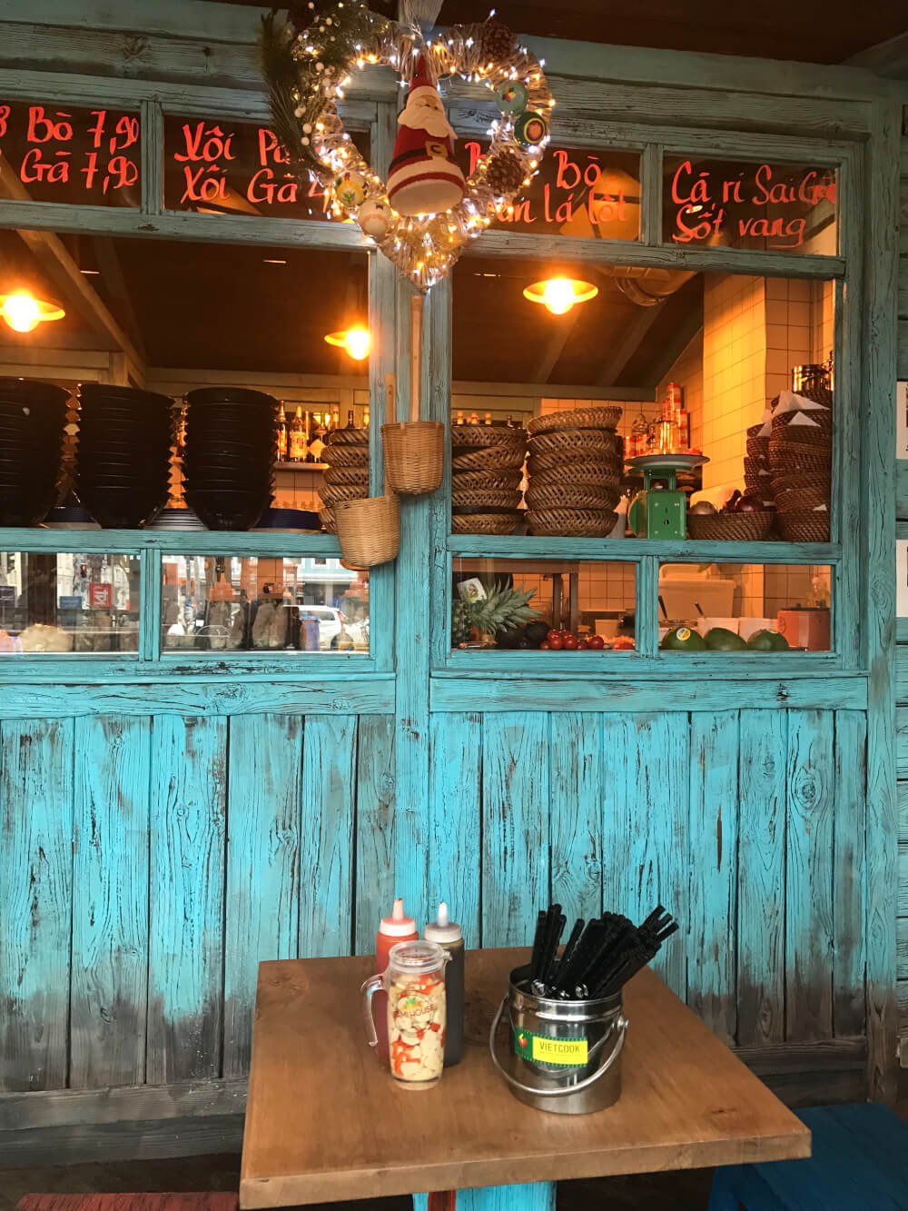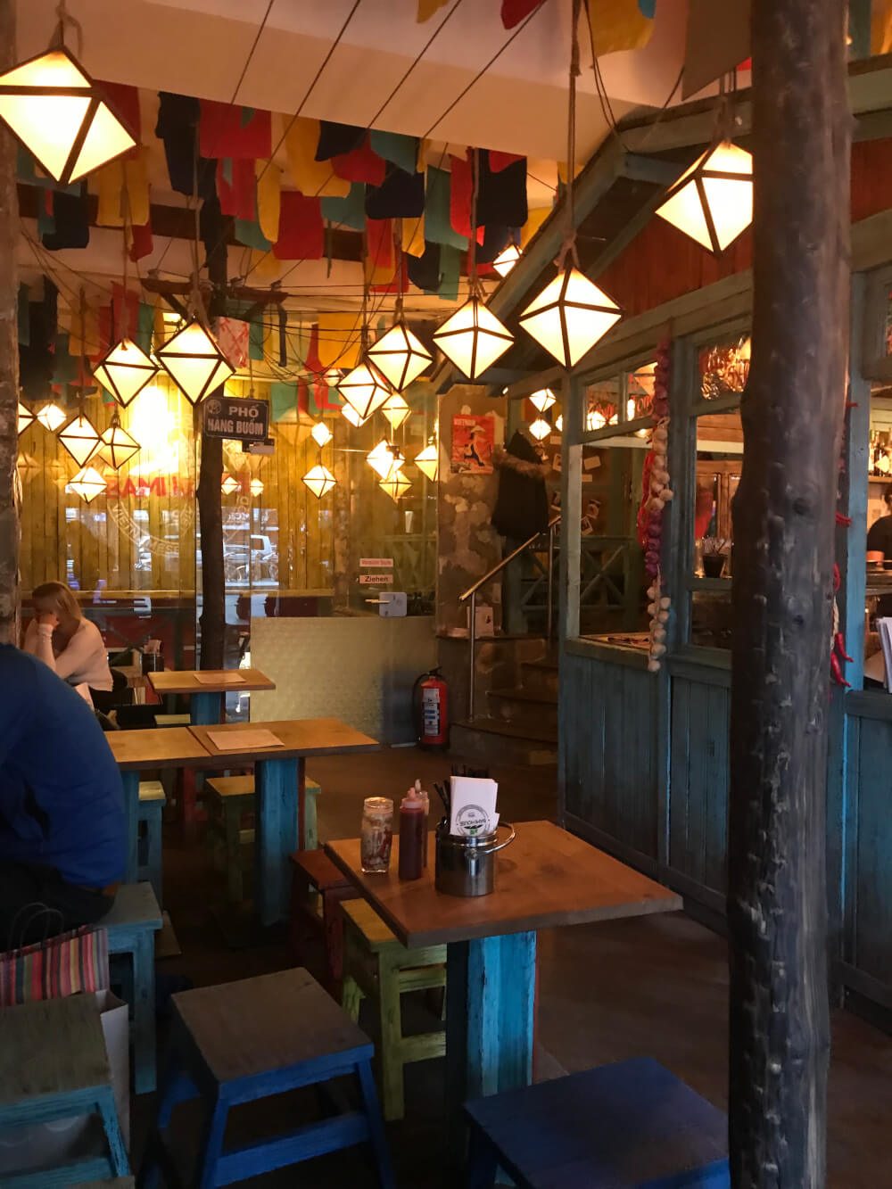 The ambiance at Bami House 1976 is awesome. It makes for a very cute cozy place for date night, with colourful decor, pretty lamps dangling from the ceiling and blue wooden details.