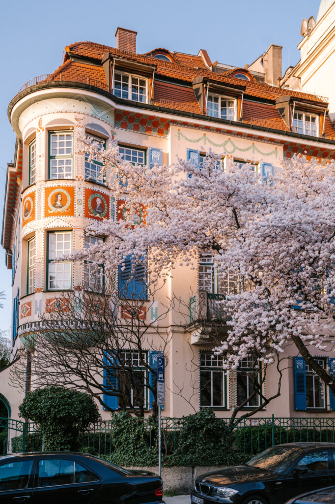 This epic villa in Schwabing is one of Munichās prettiest art nouveau mansions, and makes a glorious backdrop to the pale pink blossom-cloud currently in full bloom in front of it.