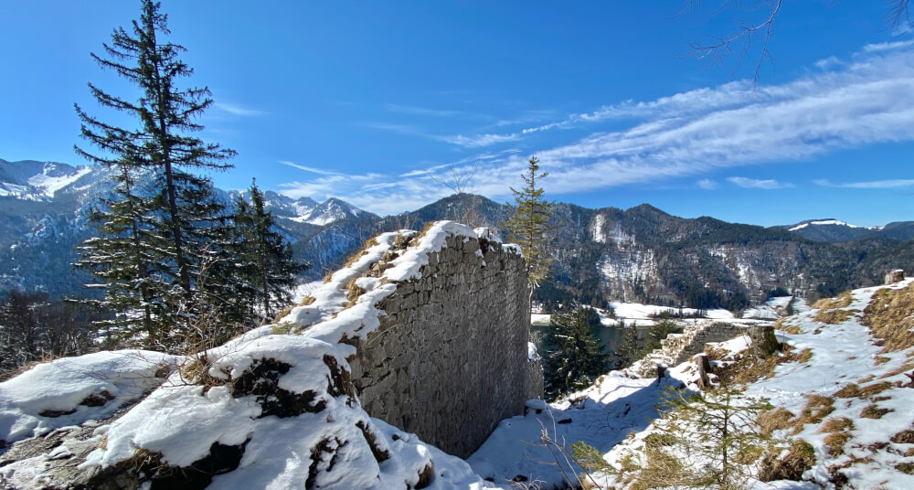Approximately an hour after leaving the lake path, you will arrive at āBurgruine Hohenwaldeckā, the ruins of a small hilltop castle and lovely view point over Schliersee.