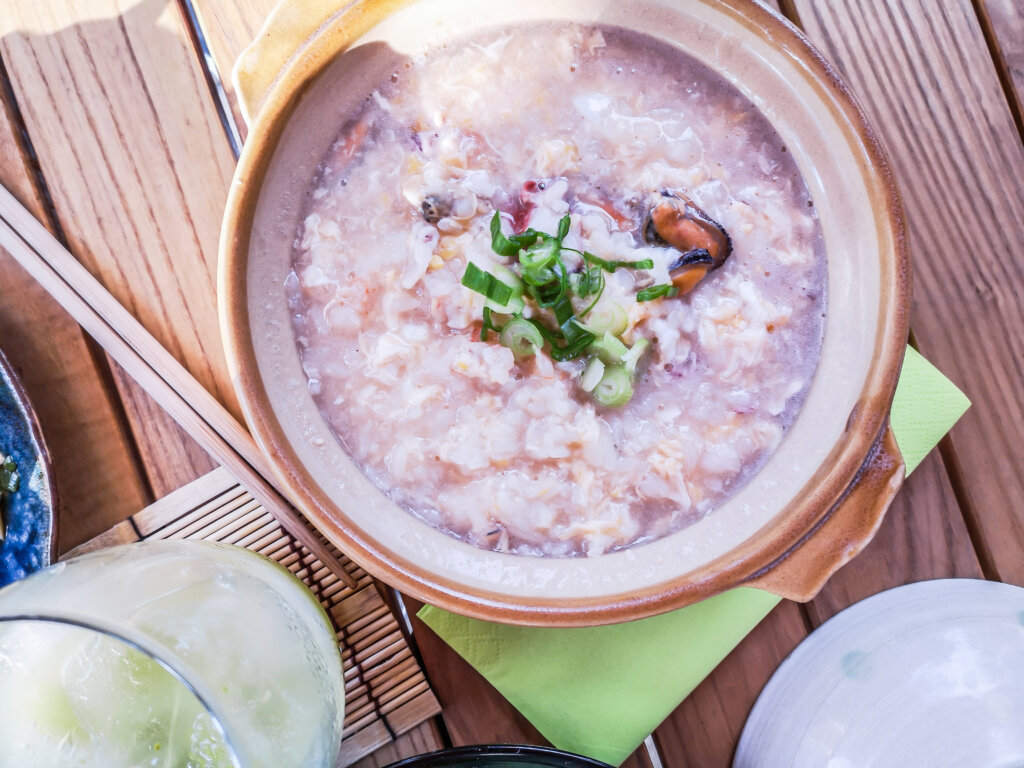 Zosui is a mild and thin Japanese rice soup which can be seasoned with miso or soy sauce and is often cooked with something like seafood, chicken, veggies or mushrooms.