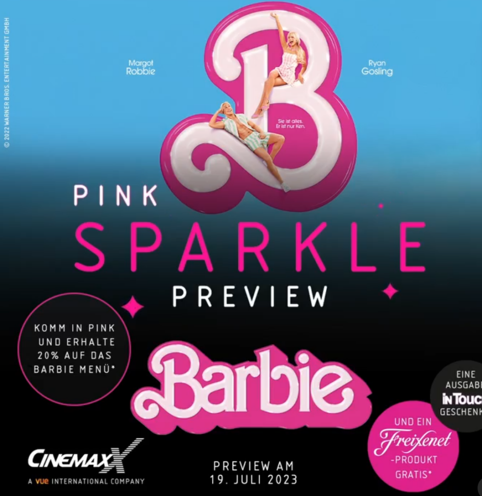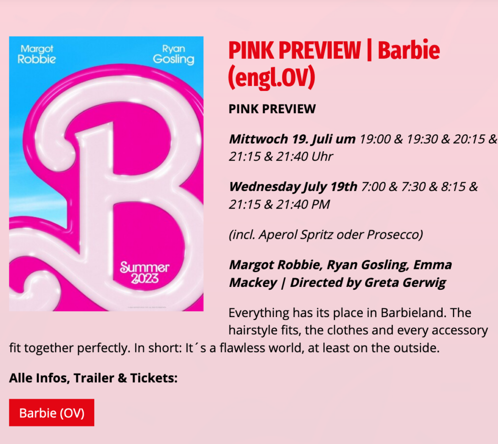 There are a multitude of cinemas (Kinos auf Deutsch) showing The Barbie Movie in English (OV) as well as English with German subtitles (OMU). As well as most offering a nice little bit of bubbly included in the experience.